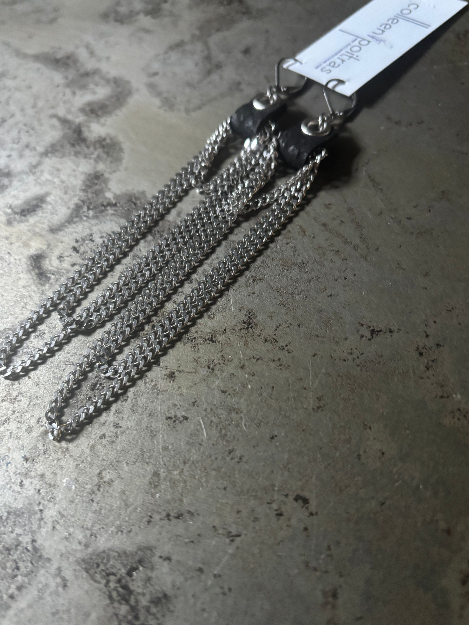 Leather, detailed, stainless steel chain dangles with a sense of elegance and drama.