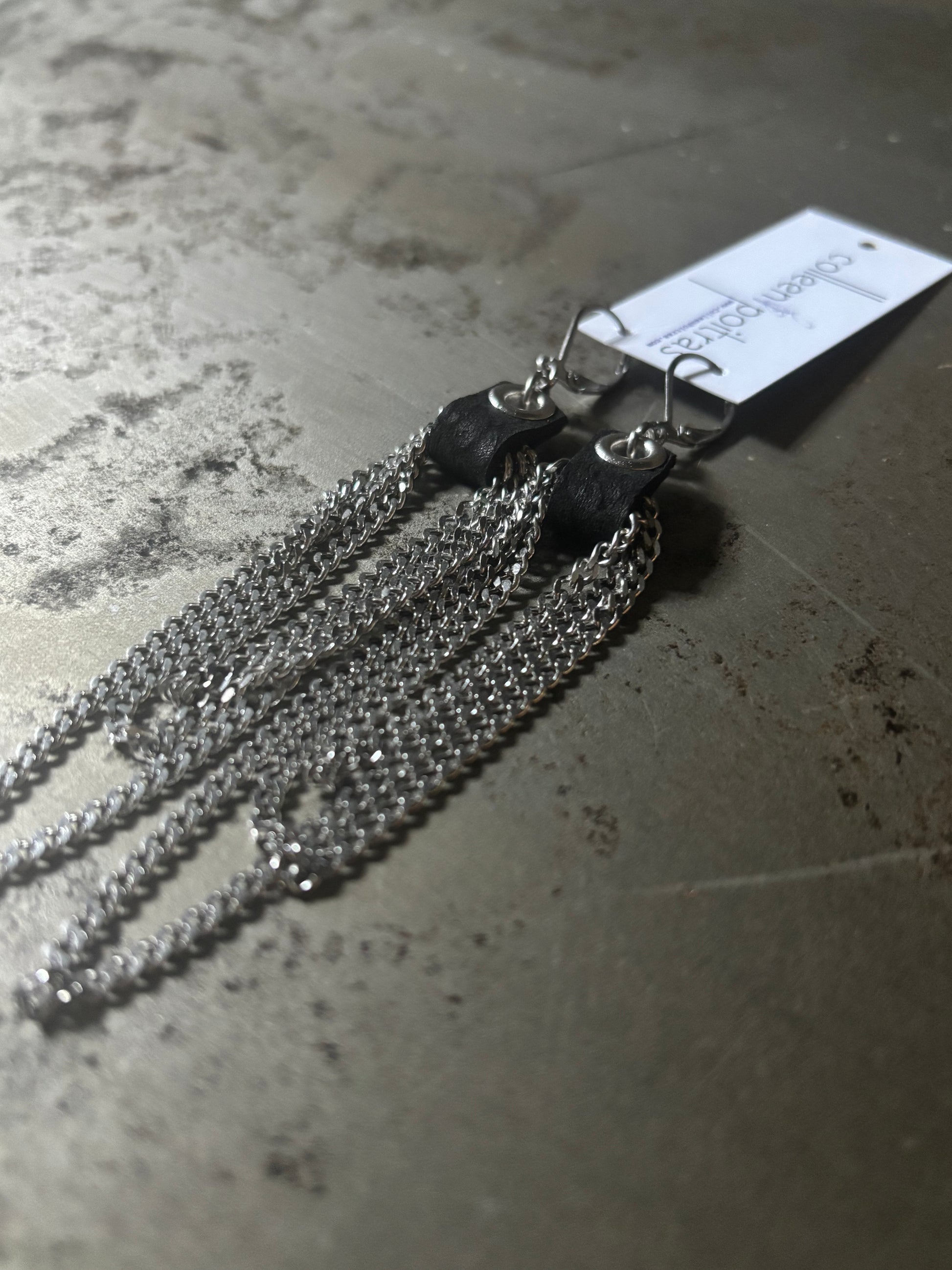 Leather, detailed, stainless steel chain dangles with a sense of elegance and drama.